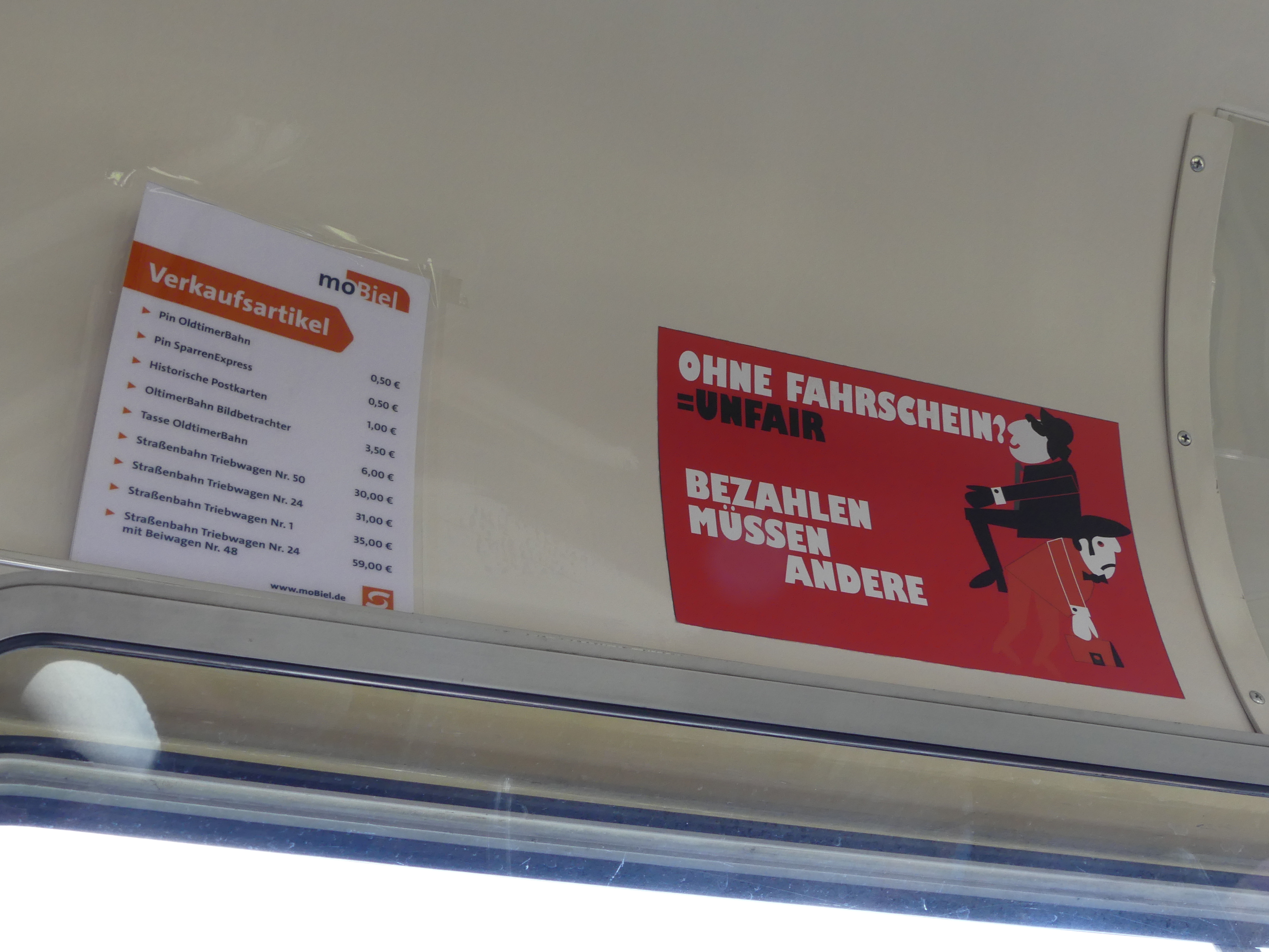 Version vom 16. Dezember 2022, 22:16 Uhr von ÖPNV in OWL (Diskussion | Beiträge) (Schild über "moBiel-Merchandise" und Schwarzfahren in der OldtimerBahn)