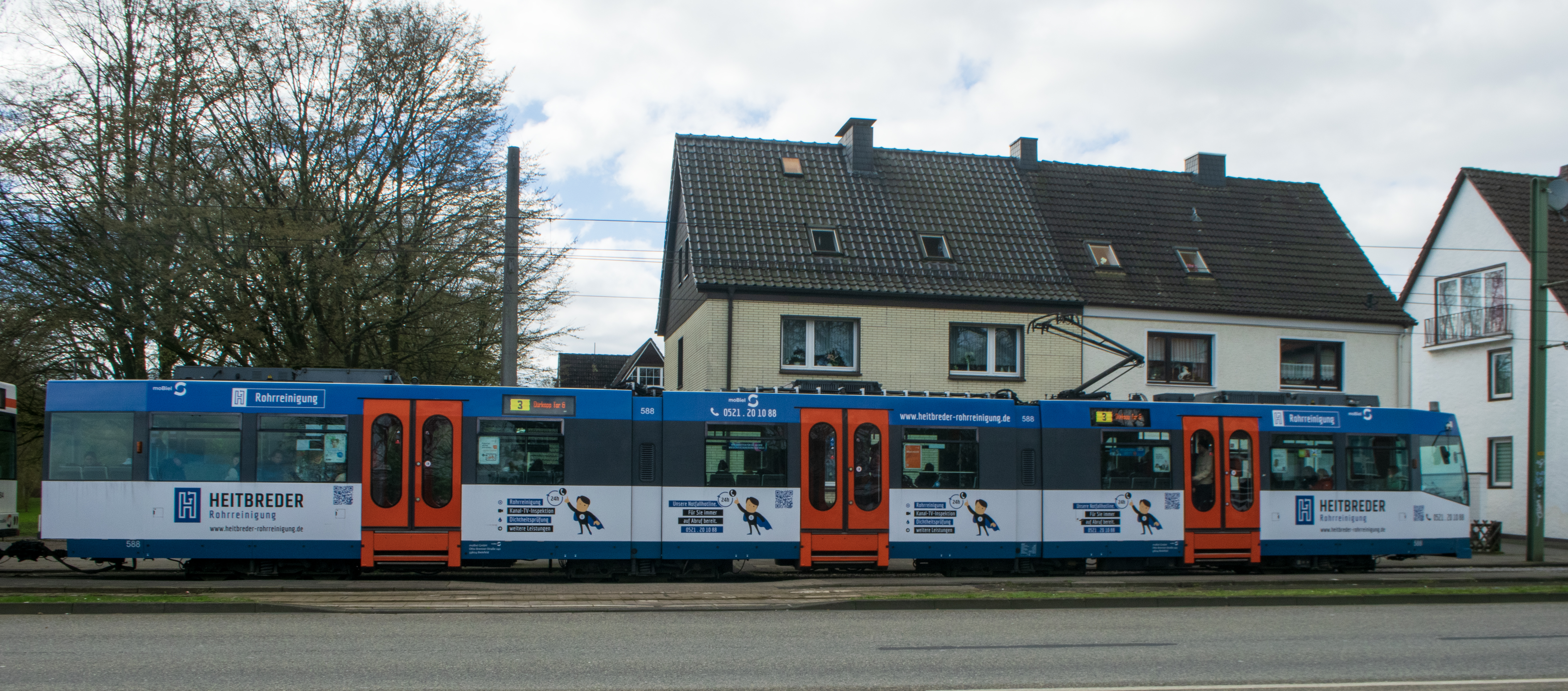 Deutsch: Seitenansicht des M8D 588 am 02.04.2023 als Linie 3 Richtung Dürkopp Tor 6 an der Haltestelle Voltmannstraße.