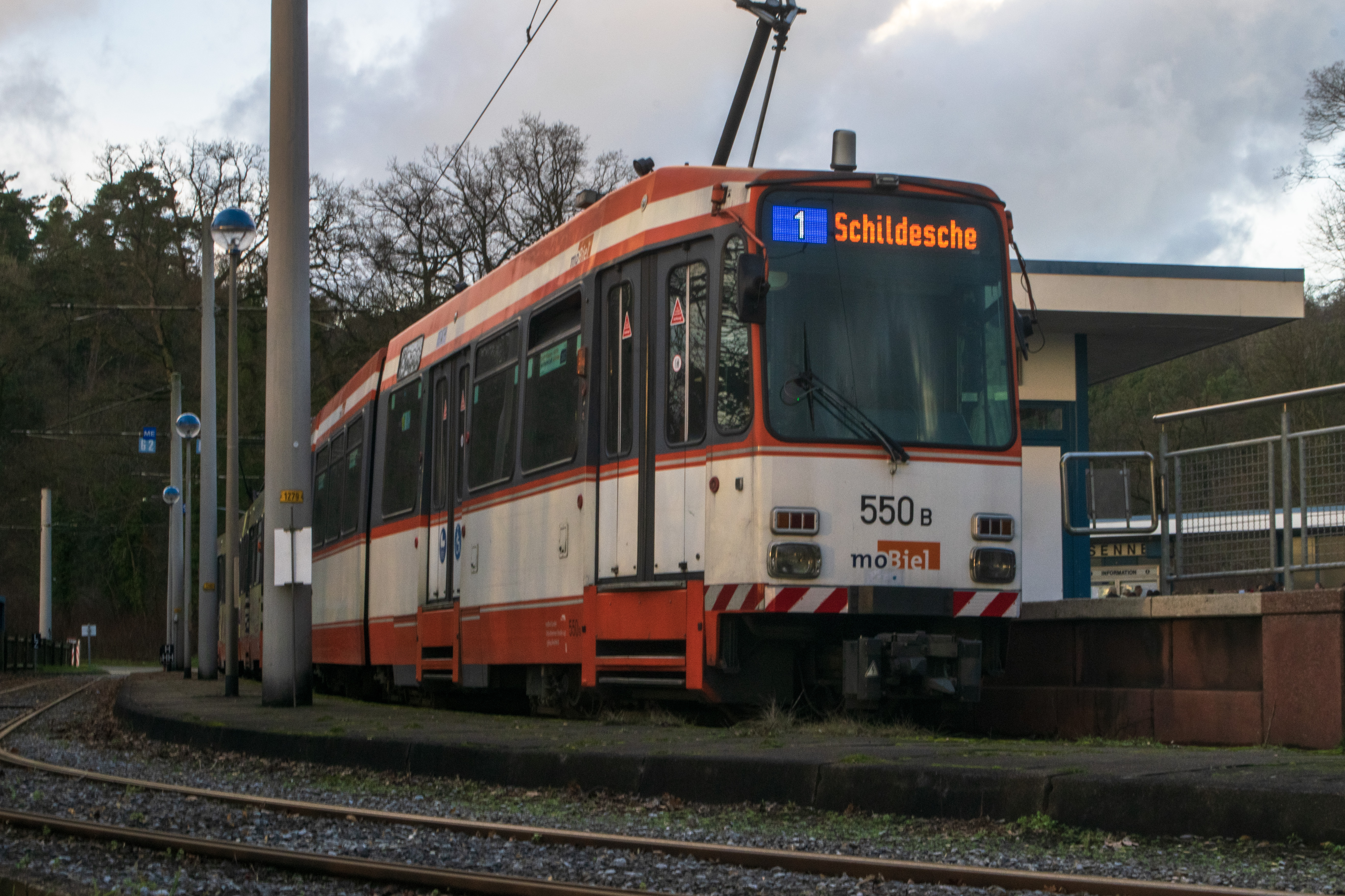 Deutsch: M8C 550 am 06.01.2022 als Linie 1 Richtung Schildesche am Einstiegsbahnsteig der Endhaltestelle Senne.