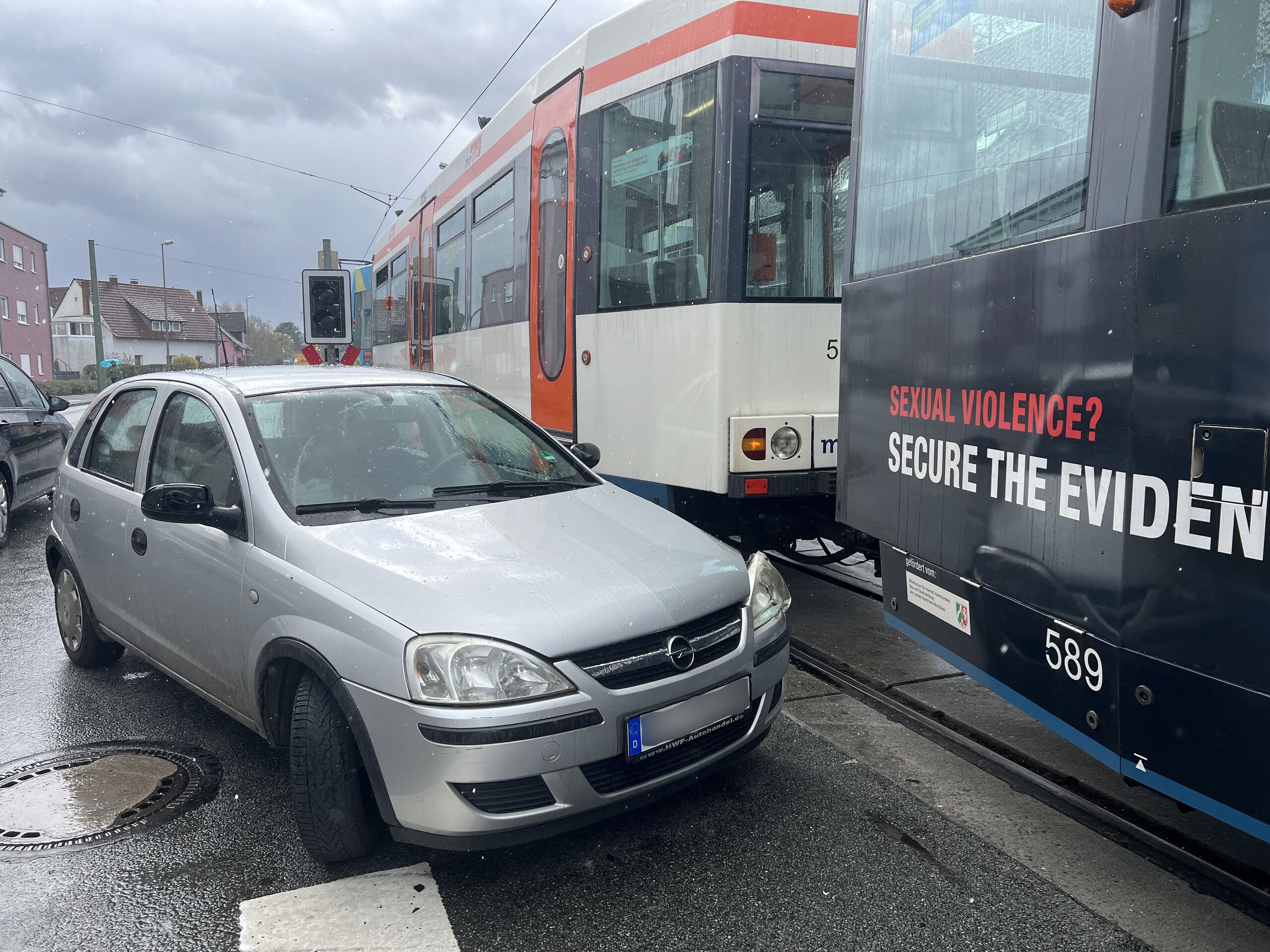 Deutsch: Kollision eines PKW mit einem Zug der Linie 1 Richtung Schildesche am 07.04.2022, bestehend aus M8D 589, MB4 512 und M8C 578.