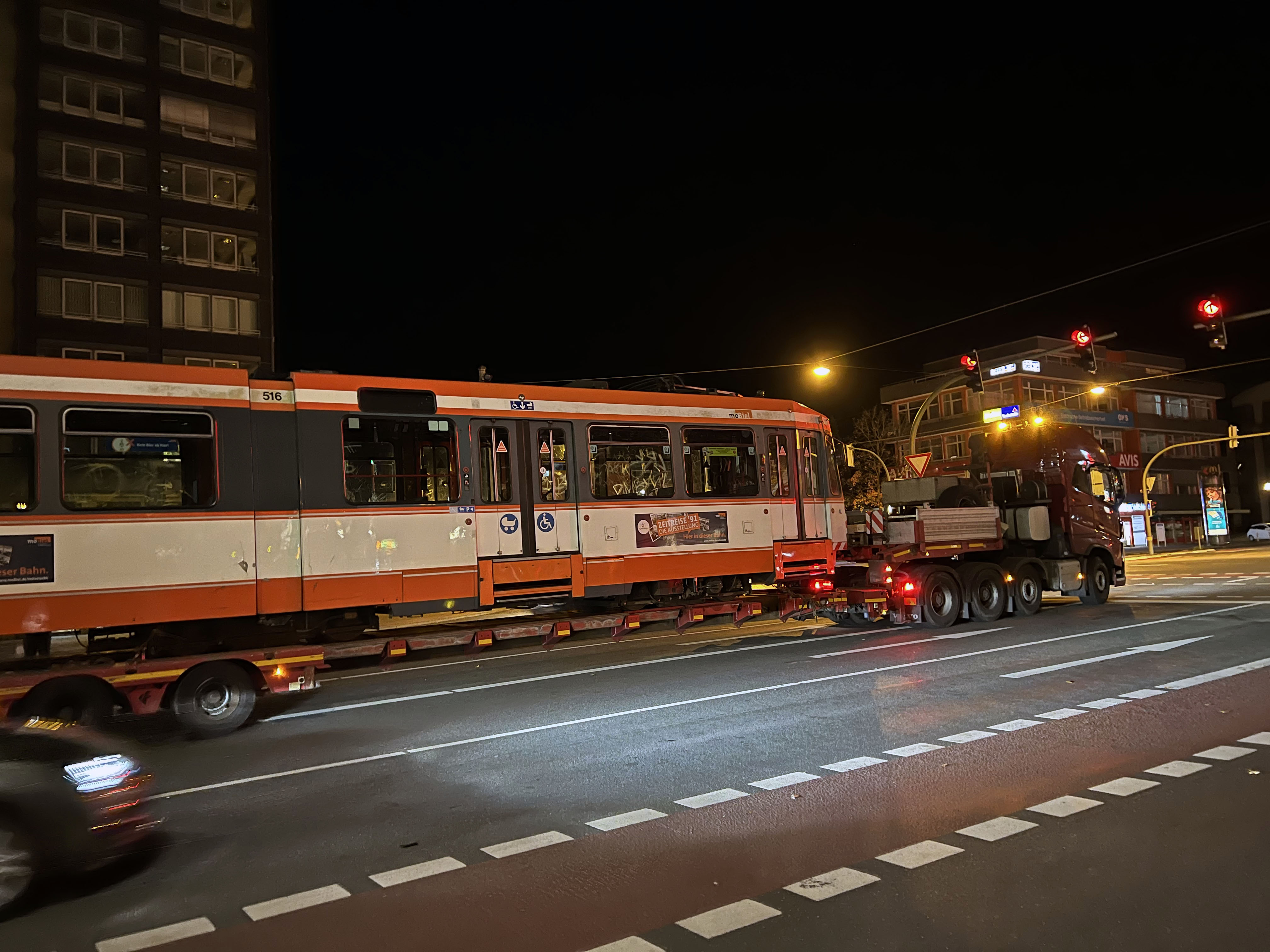 Deutsch: M8C 516 am 27.10.2021 beim Abtransport zu den MPK Łódź an der Kreuzung Otto-Brenner-Straße / Detmolder Straße. Deutlich zu erkennen sind die schweren Lackschäden.