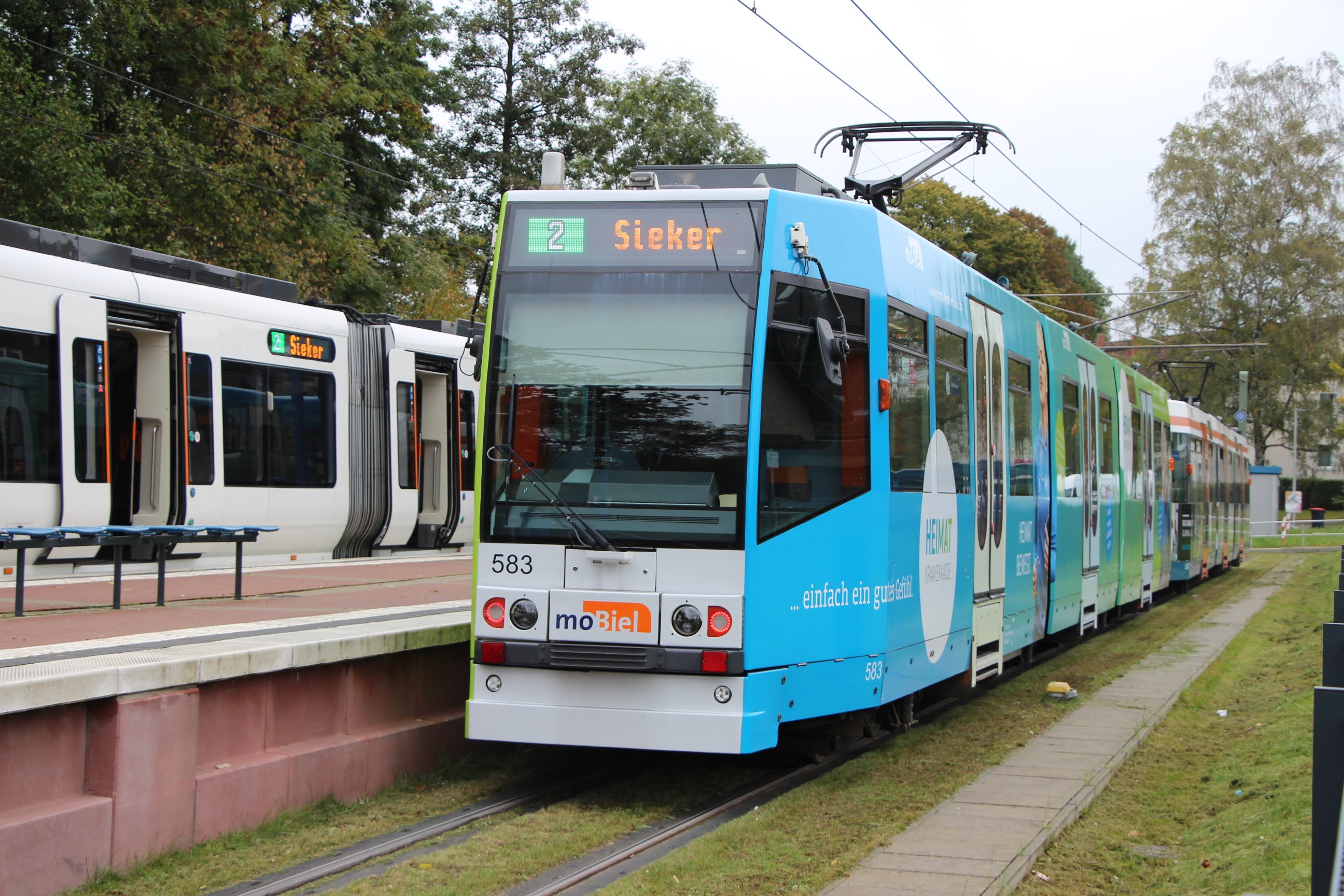 M8D 583 mit Werbung für die Heimat Krankenkasse steht in Altenhagen und fährt gleich als Linie 2 nach Sieker.