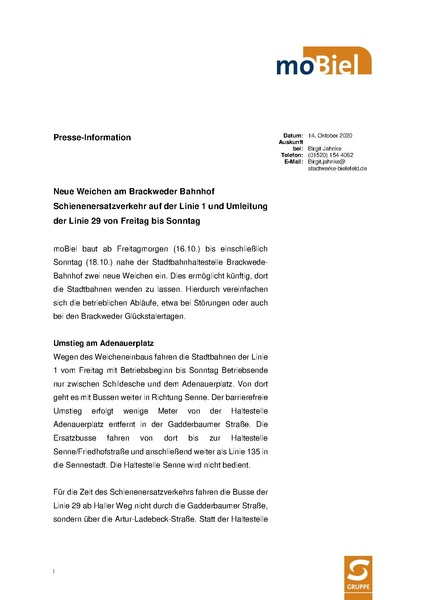 Deutsch: Pressemitteilung zum Weichenbau vom 16.10.2020 – 18.10.2020 an der Haltestelle Brackwede Bahnhof.